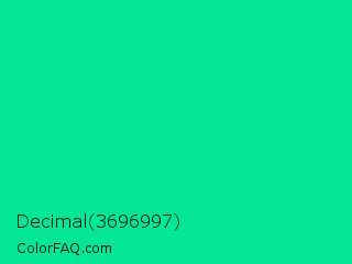 Decimal 3696997 Color is a normal green color and the nearest color is Medium Spring Green #00fa9a. Hex code #05e795 and RGB value is rgb(5,231,149). In RGB color space, this color is composed of 2% red, 91% green, 58% blue, In CMYK color space, this color is composed of 98% cyan, 0% magenta, 35% yellow , 9% black , In HSL color space, this color has a hue angle of 158° , 96% saturation and 46% lightness.