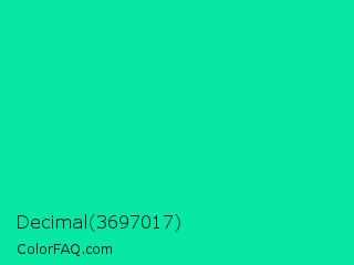 Decimal 3697017 Color is a normal green color and the nearest color is Medium Spring Green #00fa9a. Hex code #05e7a3 and RGB value is rgb(5,231,163). In RGB color space, this color is composed of 2% red, 91% green, 64% blue, In CMYK color space, this color is composed of 98% cyan, 0% magenta, 29% yellow , 9% black , In HSL color space, this color has a hue angle of 162° , 96% saturation and 46% lightness.