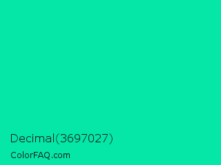 Decimal 3697027 Color is a normal green color and the nearest color is Medium Spring Green #00fa9a. Hex code #05e7a7 and RGB value is rgb(5,231,167). In RGB color space, this color is composed of 2% red, 91% green, 65% blue, In CMYK color space, this color is composed of 98% cyan, 0% magenta, 28% yellow , 9% black , In HSL color space, this color has a hue angle of 163° , 96% saturation and 46% lightness.