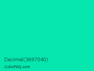 Decimal 3697040 Color is a normal cyan color and the nearest color is Medium Spring Green #00fa9a. Hex code #05e7ae and RGB value is rgb(5,231,174). In RGB color space, this color is composed of 2% red, 91% green, 68% blue, In CMYK color space, this color is composed of 98% cyan, 0% magenta, 25% yellow , 9% black , In HSL color space, this color has a hue angle of 165° , 96% saturation and 46% lightness.