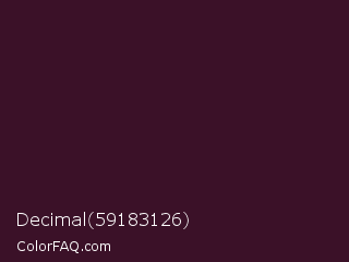 Decimal 59183126 Color is a very dark magenta color and the nearest color is Melanzane #300529. Hex code #3b1128 and RGB value is rgb(59,17,40). In RGB color space, this color is composed of 23% red, 7% green, 16% blue, In CMYK color space, this color is composed of 0% cyan, 71% magenta, 32% yellow , 77% black , In HSL color space, this color has a hue angle of 327° , 55% saturation and 15% lightness.