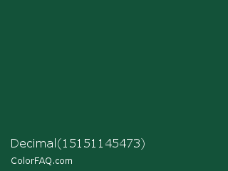 Decimal 15151145473 Color is a very dark green color and the nearest color is Brunswick Green #1b4d3e. Hex code #135239 and RGB value is rgb(19,82,57). In RGB color space, this color is composed of 7% red, 32% green, 22% blue, In CMYK color space, this color is composed of 77% cyan, 0% magenta, 30% yellow , 68% black , In HSL color space, this color has a hue angle of 156° , 62% saturation and 20% lightness.