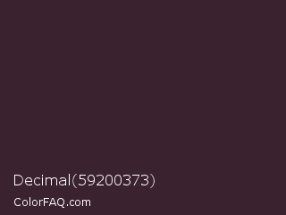 Decimal 59200373 Color is a very dark rose color and the nearest color is Thunder #33292f. Hex code #3b222f and RGB value is rgb(59,34,47). In RGB color space, this color is composed of 23% red, 13% green, 18% blue, In CMYK color space, this color is composed of 0% cyan, 42% magenta, 20% yellow , 77% black , In HSL color space, this color has a hue angle of 329° , 27% saturation and 18% lightness.