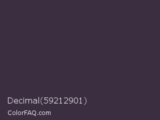 Decimal 59212901 Color is a very dark purple color and the nearest color is Tuna #353542. Hex code #3b2e41 and RGB value is rgb(59,46,65). In RGB color space, this color is composed of 23% red, 18% green, 25% blue, In CMYK color space, this color is composed of 9% cyan, 29% magenta, 0% yellow , 75% black , In HSL color space, this color has a hue angle of 281° , 17% saturation and 22% lightness.