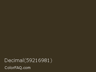 Decimal 59216981 Color is a very dark orange color and the nearest color is Olive Drab 7 #3c341f. Hex code #3b321f and RGB value is rgb(59,50,31). In RGB color space, this color is composed of 23% red, 20% green, 12% blue, In CMYK color space, this color is composed of 0% cyan, 15% magenta, 47% yellow , 77% black , In HSL color space, this color has a hue angle of 41° , 31% saturation and 18% lightness.
