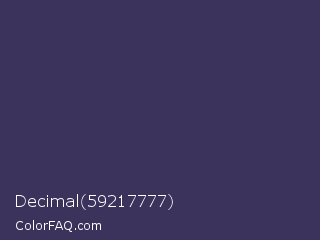 Decimal 59217777 Color is a dark indigo color and the nearest color is Martinique #363050. Hex code #3b335b and RGB value is rgb(59,51,91). In RGB color space, this color is composed of 23% red, 20% green, 36% blue, In CMYK color space, this color is composed of 35% cyan, 44% magenta, 0% yellow , 64% black , In HSL color space, this color has a hue angle of 252° , 28% saturation and 28% lightness.