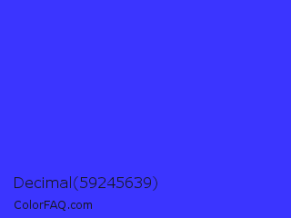 Decimal 59245639 Color is a normal indigo color and the nearest color is Palatinate Blue #273be2. Hex code #3b35ff and RGB value is rgb(59,53,255). In RGB color space, this color is composed of 23% red, 21% green, 100% blue, In CMYK color space, this color is composed of 77% cyan, 79% magenta, 0% yellow , 0% black , In HSL color space, this color has a hue angle of 242° , 100% saturation and 60% lightness.