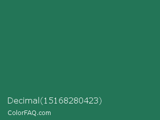 Decimal 15168280423 Color is a dark green color and the nearest color is Eucalyptus #278a5b. Hex code #237557 and RGB value is rgb(35,117,87). In RGB color space, this color is composed of 14% red, 46% green, 34% blue, In CMYK color space, this color is composed of 70% cyan, 0% magenta, 26% yellow , 54% black , In HSL color space, this color has a hue angle of 158° , 54% saturation and 30% lightness.
