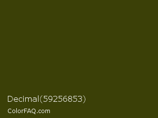 Decimal 59256853 Color is a very dark yellow color and the nearest color is Waiouru #363c0d. Hex code #3b4007 and RGB value is rgb(59,64,7). In RGB color space, this color is composed of 23% red, 25% green, 3% blue, In CMYK color space, this color is composed of 8% cyan, 0% magenta, 89% yellow , 75% black , In HSL color space, this color has a hue angle of 65° , 80% saturation and 14% lightness.
