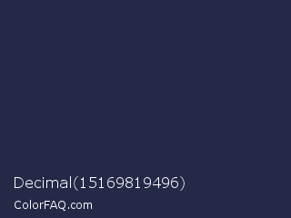 Decimal 15169819496 Color is a very dark blue color and the nearest color is Yankees Blue #1c2841. Hex code #252948 and RGB value is rgb(37,41,72). In RGB color space, this color is composed of 15% red, 16% green, 28% blue, In CMYK color space, this color is composed of 49% cyan, 43% magenta, 0% yellow , 72% black , In HSL color space, this color has a hue angle of 233° , 32% saturation and 21% lightness.
