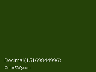 Decimal 15169844996 Color is a very dark green color and the nearest color is Turtle Green #2a380b. Hex code #254208 and RGB value is rgb(37,66,8). In RGB color space, this color is composed of 15% red, 26% green, 3% blue, In CMYK color space, this color is composed of 44% cyan, 0% magenta, 88% yellow , 74% black , In HSL color space, this color has a hue angle of 90° , 78% saturation and 15% lightness.