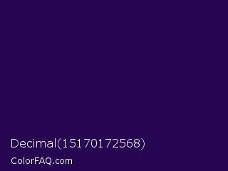 Decimal 15170172568 Color is a very dark violet color and the nearest color is Cherry Pie #2a0359. Hex code #260552 and RGB value is rgb(38,5,82). In RGB color space, this color is composed of 15% red, 2% green, 32% blue, In CMYK color space, this color is composed of 54% cyan, 94% magenta, 0% yellow , 68% black , In HSL color space, this color has a hue angle of 266° , 89% saturation and 17% lightness.