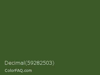 Decimal 59282503 Color is a dark green color and the nearest color is Mughal Green #306030. Hex code #3b5927 and RGB value is rgb(59,89,39). In RGB color space, this color is composed of 23% red, 35% green, 15% blue, In CMYK color space, this color is composed of 34% cyan, 0% magenta, 56% yellow , 65% black , In HSL color space, this color has a hue angle of 96° , 39% saturation and 25% lightness.