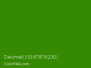 Decimal 15187876230 Color is a dark green color and the nearest color is Napier Green #2a8000. Hex code #368902 and RGB value is rgb(54,137,2). In RGB color space, this color is composed of 21% red, 54% green, 1% blue, In CMYK color space, this color is composed of 61% cyan, 0% magenta, 99% yellow , 46% black , In HSL color space, this color has a hue angle of 97° , 97% saturation and 27% lightness.
