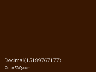 Decimal 15189767177 Color is a very dark orange color and the nearest color is Brown Pod #401801. Hex code #391701 and RGB value is rgb(57,23,1). In RGB color space, this color is composed of 22% red, 9% green, 0% blue, In CMYK color space, this color is composed of 0% cyan, 60% magenta, 98% yellow , 78% black , In HSL color space, this color has a hue angle of 24° , 97% saturation and 11% lightness.