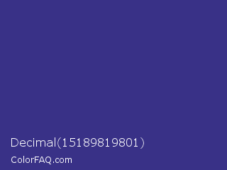 Decimal 15189819801 Color is a normal indigo color and the nearest color is Minsk #3f307f. Hex code #393187 and RGB value is rgb(57,49,135). In RGB color space, this color is composed of 22% red, 19% green, 53% blue, In CMYK color space, this color is composed of 58% cyan, 64% magenta, 0% yellow , 47% black , In HSL color space, this color has a hue angle of 246° , 47% saturation and 36% lightness.