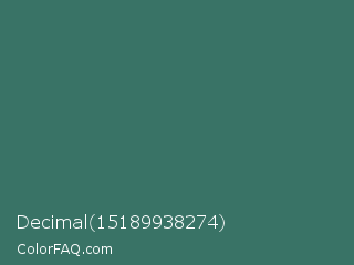 Decimal 15189938274 Color is a normal cyan color and the nearest color is William #3a686c. Hex code #397366 and RGB value is rgb(57,115,102). In RGB color space, this color is composed of 22% red, 45% green, 40% blue, In CMYK color space, this color is composed of 50% cyan, 0% magenta, 11% yellow , 55% black , In HSL color space, this color has a hue angle of 167° , 34% saturation and 34% lightness.
