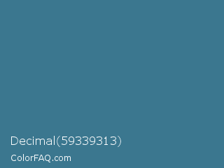 Decimal 59339313 Color is a normal blue color and the nearest color is Teal Blue #367588. Hex code #3b778f and RGB value is rgb(59,119,143). In RGB color space, this color is composed of 23% red, 47% green, 56% blue, In CMYK color space, this color is composed of 59% cyan, 17% magenta, 0% yellow , 44% black , In HSL color space, this color has a hue angle of 197° , 42% saturation and 40% lightness.