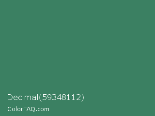 Decimal 59348112 Color is a normal green color and the nearest color is Viridian #40826d. Hex code #3b8062 and RGB value is rgb(59,128,98). In RGB color space, this color is composed of 23% red, 50% green, 38% blue, In CMYK color space, this color is composed of 54% cyan, 0% magenta, 23% yellow , 50% black , In HSL color space, this color has a hue angle of 154° , 37% saturation and 37% lightness.