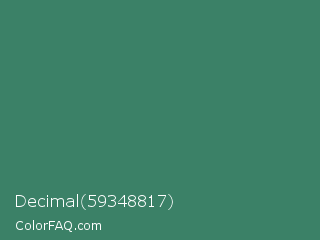 Decimal 59348817 Color is a normal green color and the nearest color is Viridian #40826d. Hex code #3b8167 and RGB value is rgb(59,129,103). In RGB color space, this color is composed of 23% red, 51% green, 40% blue, In CMYK color space, this color is composed of 54% cyan, 0% magenta, 20% yellow , 49% black , In HSL color space, this color has a hue angle of 158° , 37% saturation and 37% lightness.