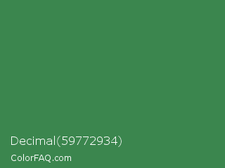 Decimal 59772934 Color is a normal green color and the nearest color is Goblin #3d7d52. Hex code #3b864e and RGB value is rgb(59,134,78). In RGB color space, this color is composed of 23% red, 53% green, 31% blue, In CMYK color space, this color is composed of 56% cyan, 0% magenta, 42% yellow , 47% black , In HSL color space, this color has a hue angle of 135° , 39% saturation and 38% lightness.