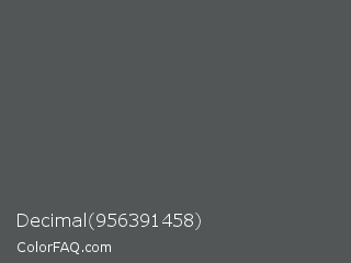 Decimal 956391458 Color is a normal cyan color and the nearest color is Davys Grey #555555. Hex code #535656 and RGB value is rgb(83,86,86). In RGB color space, this color is composed of 33% red, 34% green, 34% blue, In CMYK color space, this color is composed of 3% cyan, 0% magenta, 0% yellow , 66% black , In HSL color space, this color has a hue angle of 180° , 2% saturation and 33% lightness.