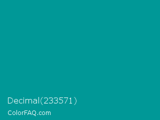 Decimal 233571 Color is a dark cyan color and the nearest color is Viridian Green #009698. Hex code #009897 and RGB value is rgb(0,152,151). In RGB color space, this color is composed of 0% red, 60% green, 59% blue, In CMYK color space, this color is composed of 100% cyan, 0% magenta, 1% yellow , 40% black , In HSL color space, this color has a hue angle of 180° , 100% saturation and 30% lightness.
