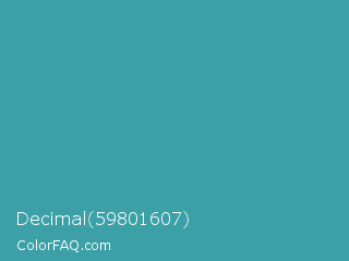 Decimal 59801607 Color is a normal cyan color and the nearest color is Keppel #3ab09e. Hex code #3ba1a7 and RGB value is rgb(59,161,167). In RGB color space, this color is composed of 23% red, 63% green, 65% blue, In CMYK color space, this color is composed of 65% cyan, 4% magenta, 0% yellow , 35% black , In HSL color space, this color has a hue angle of 183° , 48% saturation and 44% lightness.