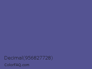 Decimal 956827728 Color is a normal indigo color and the nearest color is Victoria #534491. Hex code #545392 and RGB value is rgb(84,83,146). In RGB color space, this color is composed of 33% red, 33% green, 57% blue, In CMYK color space, this color is composed of 42% cyan, 43% magenta, 0% yellow , 43% black , In HSL color space, this color has a hue angle of 241° , 28% saturation and 45% lightness.