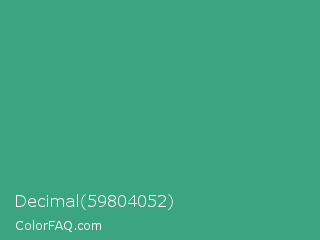 Decimal 59804052 Color is a normal green color and the nearest color is Zomp #39a78e. Hex code #3ba582 and RGB value is rgb(59,165,130). In RGB color space, this color is composed of 23% red, 65% green, 51% blue, In CMYK color space, this color is composed of 64% cyan, 0% magenta, 21% yellow , 35% black , In HSL color space, this color has a hue angle of 160° , 47% saturation and 44% lightness.
