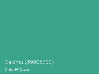 Decimal 59805700 Color is a normal cyan color and the nearest color is Zomp #39a78e. Hex code #3ba58c and RGB value is rgb(59,165,140). In RGB color space, this color is composed of 23% red, 65% green, 55% blue, In CMYK color space, this color is composed of 64% cyan, 0% magenta, 15% yellow , 35% black , In HSL color space, this color has a hue angle of 166° , 47% saturation and 44% lightness.