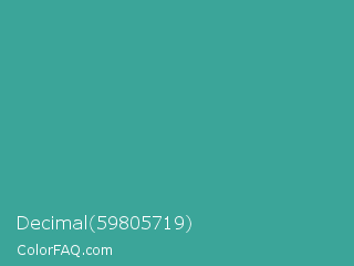 Decimal 59805719 Color is a normal cyan color and the nearest color is Zomp #39a78e. Hex code #3ba599 and RGB value is rgb(59,165,153). In RGB color space, this color is composed of 23% red, 65% green, 60% blue, In CMYK color space, this color is composed of 64% cyan, 0% magenta, 7% yellow , 35% black , In HSL color space, this color has a hue angle of 173° , 47% saturation and 44% lightness.