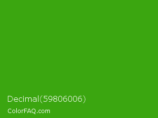 Decimal 59806006 Color is a normal green color and the nearest color is Slimy Green #299617. Hex code #3ba610 and RGB value is rgb(59,166,16). In RGB color space, this color is composed of 23% red, 65% green, 6% blue, In CMYK color space, this color is composed of 64% cyan, 0% magenta, 90% yellow , 35% black , In HSL color space, this color has a hue angle of 103° , 82% saturation and 36% lightness.