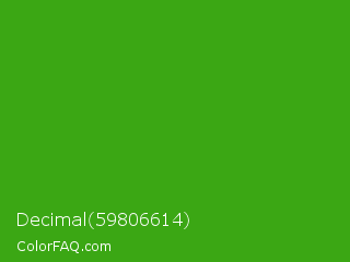 Decimal 59806614 Color is a normal green color and the nearest color is Slimy Green #299617. Hex code #3ba714 and RGB value is rgb(59,167,20). In RGB color space, this color is composed of 23% red, 65% green, 8% blue, In CMYK color space, this color is composed of 65% cyan, 0% magenta, 88% yellow , 35% black , In HSL color space, this color has a hue angle of 104° , 79% saturation and 37% lightness.