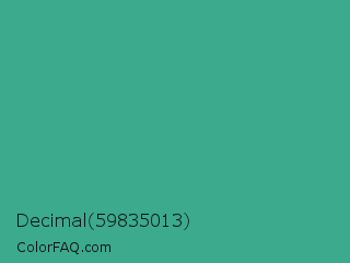 Decimal 59835013 Color is a normal cyan color and the nearest color is Zomp #39a78e. Hex code #3baa8d and RGB value is rgb(59,170,141). In RGB color space, this color is composed of 23% red, 67% green, 55% blue, In CMYK color space, this color is composed of 65% cyan, 0% magenta, 17% yellow , 33% black , In HSL color space, this color has a hue angle of 164° , 48% saturation and 45% lightness.