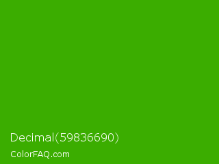 Decimal 59836690 Color is a normal green color and the nearest color is Kelly Green #4cbb17. Hex code #3bad00 and RGB value is rgb(59,173,0). In RGB color space, this color is composed of 23% red, 68% green, 0% blue, In CMYK color space, this color is composed of 66% cyan, 0% magenta, 100% yellow , 32% black , In HSL color space, this color has a hue angle of 100° , 100% saturation and 34% lightness.