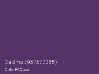 Decimal 957577365 Color is a dark purple color and the nearest color is Imperial #602f6b. Hex code #553267 and RGB value is rgb(85,50,103). In RGB color space, this color is composed of 33% red, 20% green, 40% blue, In CMYK color space, this color is composed of 17% cyan, 51% magenta, 0% yellow , 60% black , In HSL color space, this color has a hue angle of 280° , 35% saturation and 30% lightness.