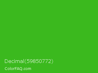 Decimal 59850772 Color is a normal green color and the nearest color is Kelly Green #4cbb17. Hex code #3bb91e and RGB value is rgb(59,185,30). In RGB color space, this color is composed of 23% red, 73% green, 12% blue, In CMYK color space, this color is composed of 68% cyan, 0% magenta, 84% yellow , 27% black , In HSL color space, this color has a hue angle of 109° , 72% saturation and 42% lightness.