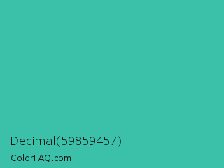 Decimal 59859457 Color is a normal cyan color and the nearest color is Puerto Rico #3fc1aa. Hex code #3bc1a9 and RGB value is rgb(59,193,169). In RGB color space, this color is composed of 23% red, 76% green, 66% blue, In CMYK color space, this color is composed of 69% cyan, 0% magenta, 12% yellow , 24% black , In HSL color space, this color has a hue angle of 169° , 53% saturation and 49% lightness.