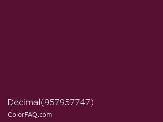 Decimal 957957747 Color is a very dark rose color and the nearest color is Mulberry Wood #5c0536. Hex code #561031 and RGB value is rgb(86,16,49). In RGB color space, this color is composed of 34% red, 6% green, 19% blue, In CMYK color space, this color is composed of 0% cyan, 81% magenta, 43% yellow , 66% black , In HSL color space, this color has a hue angle of 332° , 69% saturation and 20% lightness.
