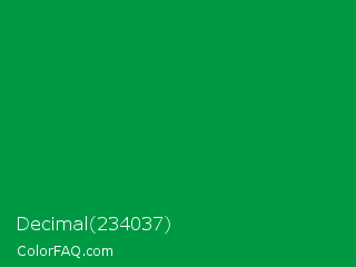 Decimal 234037 Color is a dark green color and the nearest color is Spanish Green #009150. Hex code #009943 and RGB value is rgb(0,153,67). In RGB color space, this color is composed of 0% red, 60% green, 26% blue, In CMYK color space, this color is composed of 100% cyan, 0% magenta, 56% yellow , 40% black , In HSL color space, this color has a hue angle of 146° , 100% saturation and 30% lightness.
