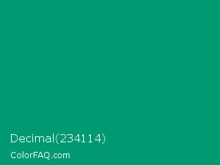 Decimal 234114 Color is a dark cyan color and the nearest color is Green NCS #009f6b. Hex code #009972 and RGB value is rgb(0,153,114). In RGB color space, this color is composed of 0% red, 60% green, 45% blue, In CMYK color space, this color is composed of 100% cyan, 0% magenta, 25% yellow , 40% black , In HSL color space, this color has a hue angle of 165° , 100% saturation and 30% lightness.