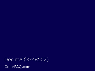 Decimal 3748502 Color is a very dark indigo color and the nearest color is Stratos #000741. Hex code #060050 and RGB value is rgb(6,0,80). In RGB color space, this color is composed of 2% red, 0% green, 31% blue, In CMYK color space, this color is composed of 93% cyan, 100% magenta, 0% yellow , 69% black , In HSL color space, this color has a hue angle of 245° , 100% saturation and 16% lightness.