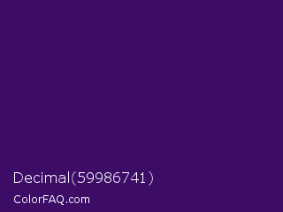 Decimal 59986741 Color is a dark purple color and the nearest color is Christalle #33036b. Hex code #3c0c67 and RGB value is rgb(60,12,103). In RGB color space, this color is composed of 24% red, 5% green, 40% blue, In CMYK color space, this color is composed of 42% cyan, 88% magenta, 0% yellow , 60% black , In HSL color space, this color has a hue angle of 272° , 79% saturation and 23% lightness.