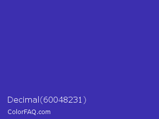 Decimal 60048231 Color is a normal indigo color and the nearest color is Governor Bay #2f3cb3. Hex code #3c2faf and RGB value is rgb(60,47,175). In RGB color space, this color is composed of 24% red, 18% green, 69% blue, In CMYK color space, this color is composed of 66% cyan, 73% magenta, 0% yellow , 31% black , In HSL color space, this color has a hue angle of 246° , 58% saturation and 44% lightness.