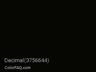 Decimal 3756644 Color is a almost black lime color and the nearest color is Rich Black FOGRA39 #010203. Hex code #060800 and RGB value is rgb(6,8,0). In RGB color space, this color is composed of 2% red, 3% green, 0% blue, In CMYK color space, this color is composed of 25% cyan, 0% magenta, 100% yellow , 97% black , In HSL color space, this color has a hue angle of 75° , 100% saturation and 2% lightness.