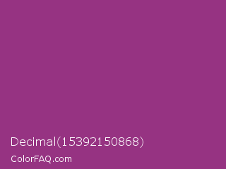 Decimal 15392150868 Color is a normal magenta color and the nearest color is Maximum Red Purple #a63a79. Hex code #963382 and RGB value is rgb(150,51,130). In RGB color space, this color is composed of 59% red, 20% green, 51% blue, In CMYK color space, this color is composed of 0% cyan, 66% magenta, 13% yellow , 41% black , In HSL color space, this color has a hue angle of 312° , 49% saturation and 39% lightness.