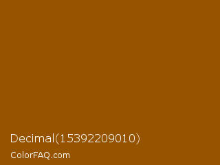 Decimal 15392209010 Color is a dark orange color and the nearest color is Chelsea Gem #9e5302. Hex code #965400 and RGB value is rgb(150,84,0). In RGB color space, this color is composed of 59% red, 33% green, 0% blue, In CMYK color space, this color is composed of 0% cyan, 44% magenta, 100% yellow , 41% black , In HSL color space, this color has a hue angle of 34° , 100% saturation and 29% lightness.