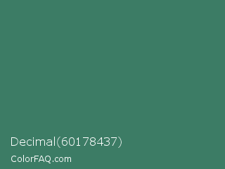 Decimal 60178437 Color is a normal green color and the nearest color is Viridian #40826d. Hex code #3c7c65 and RGB value is rgb(60,124,101). In RGB color space, this color is composed of 24% red, 49% green, 40% blue, In CMYK color space, this color is composed of 52% cyan, 0% magenta, 19% yellow , 51% black , In HSL color space, this color has a hue angle of 158° , 35% saturation and 36% lightness.