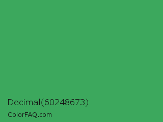 Decimal 60248673 Color is a normal green color and the nearest color is Chateau Green #40a860. Hex code #3ca85d and RGB value is rgb(60,168,93). In RGB color space, this color is composed of 24% red, 66% green, 36% blue, In CMYK color space, this color is composed of 64% cyan, 0% magenta, 45% yellow , 34% black , In HSL color space, this color has a hue angle of 138° , 47% saturation and 45% lightness.